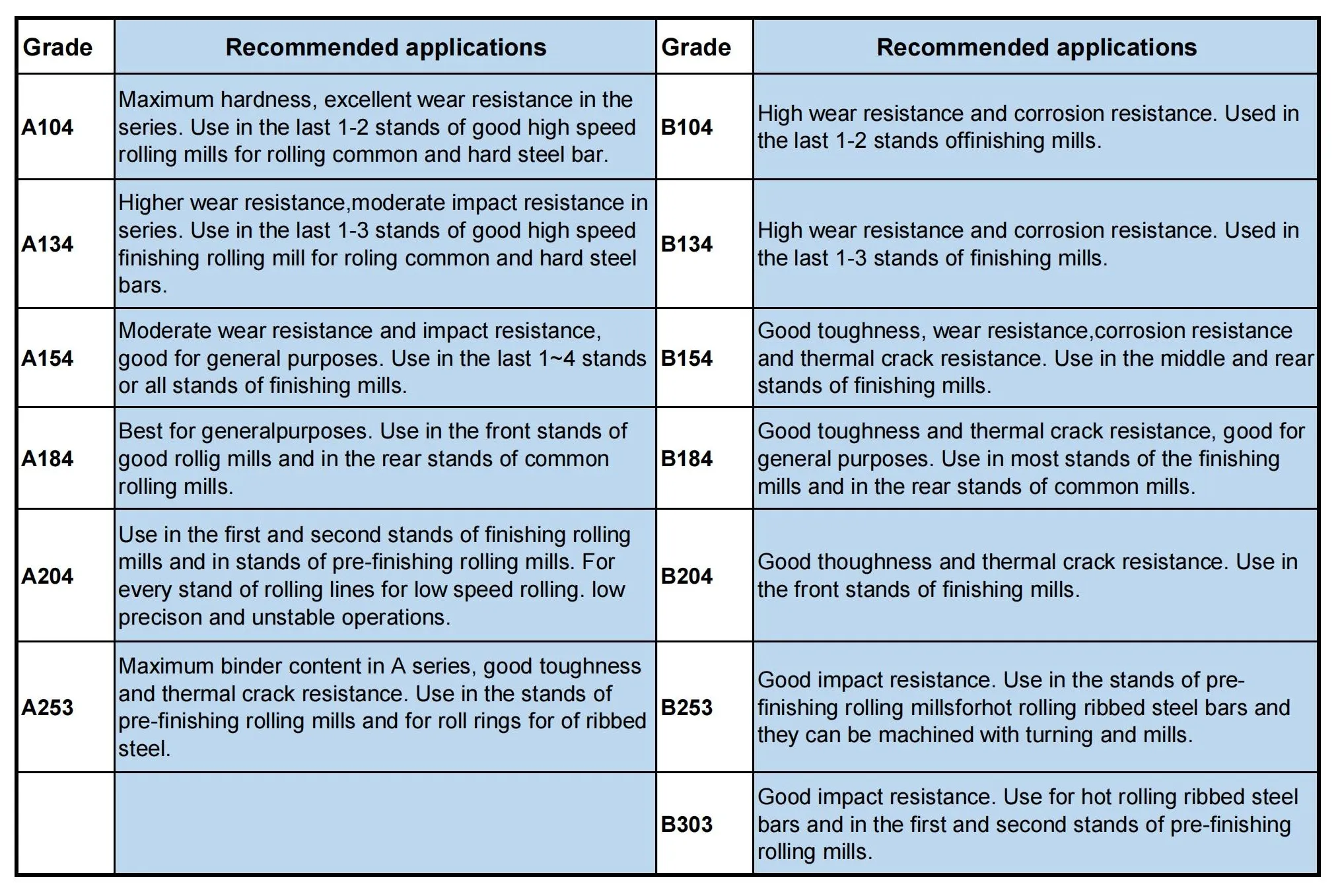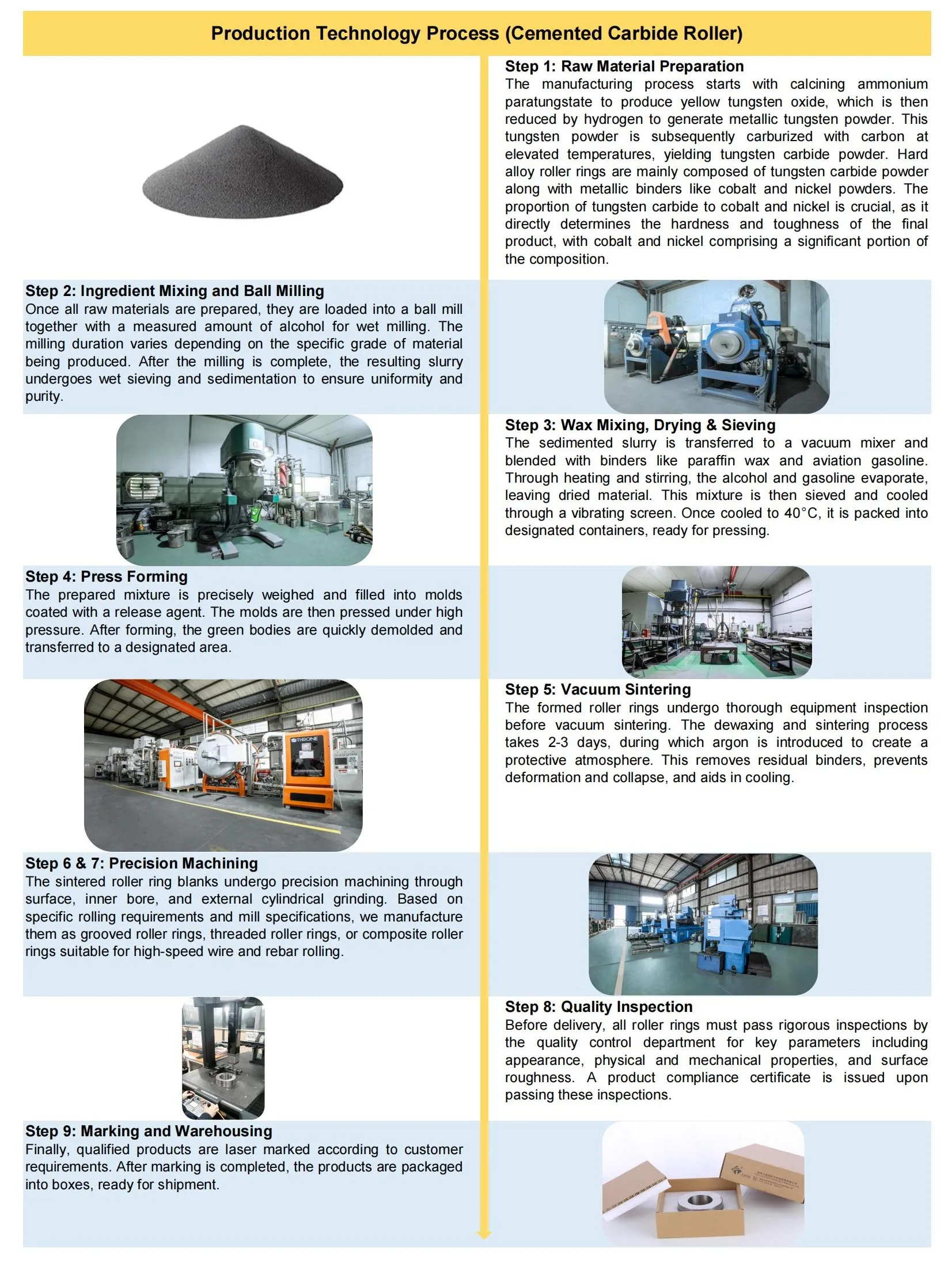 Çimentolu karbür merdane halkaları (aynı zamanda Tungsten Karbür Rulo Halkaları olarak da bilinir) mükemmel termal iletkenlik sunar ve yüksek sıcaklıklarda minimum sertlik azalmasıyla birlikte ısı direnci, aşınma direnci ve dayanıklılık açısından birinci nesil dökme demir ve yüksek hızlı çelik merdanelerden daha iyi performans gösterir. Yüksek hızlı filmaşin fabrikalarıyla birlikte geliştirilen bu ürünler artık yüksek hızlı tel, inşaat demiri ve deforme çelik çubukların üretimi için bitirme tezgahlarında yaygın olarak kullanılıyor.